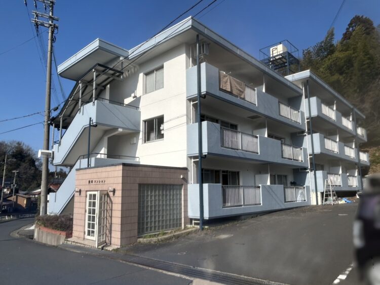 京都府京丹後市Aマンション 工事内容:仮設足場工事、下地補修工事、シーリング工事、外壁塗装工事、防水工事 2026年3月完工