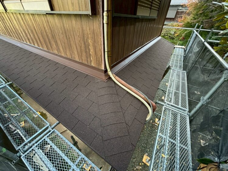 南丹市O様邸 工事内容:直接仮設工事、下屋根アスファルトシングル葺き替え工事、雨樋補修工事、天井プリントベニヤ貼り替え工事 2025年11月完工
